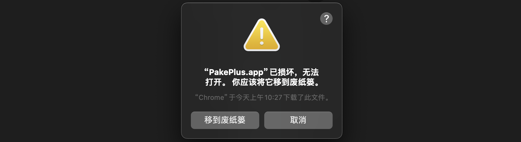 sudo xattr -r -d com.apple.quarantine /Applications/PakePlus.app- When you package an application, Mac users may see a warning saying "the application is damaged" during installation. **Please click 'Cancel', then run the following command, enter your computer password, and reopen the application: